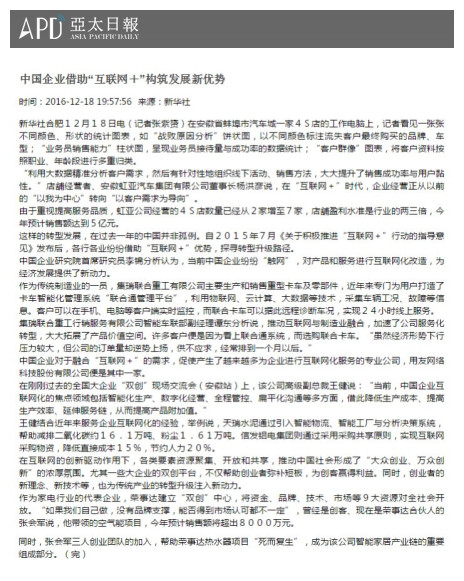 Due to the emphasis on improving service quality, the number of 4s stores operated by Hongya Co. has increased from 2 to 7, and the profitability of the stores is two or three times that of the industry. The estimated sales amount of this year are 500 million yuan.Such a transformationt is not alone in China over past year. Since the release of the Guiding Opinions on Actively Promoting Internet Plus Actions in July 2015, all walks of life have made use of the advantages of "Internet +" to explore the path of transformation and upgrading.