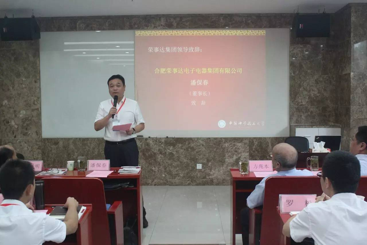 合肥荣事达电子电器集团有限公司董事长潘保春代表集团致辞,潘保春董事长首先表达了对荣事达人才培养工作给予支持的同仁和老师的衷心感谢。潘董提到,有中国“科技英才的摇篮”之称的中国科学技术大学培养和塑造了众多的社会英才;而以“全国大企业双创典范”享誉全国的荣事达,则搭建“智能家居全价值链双创中心”平台,面向全社会免费开放大企业优势资源,培养了一大批有责任心、有担当、富家国情怀的企业家。本次研修班是中国科大与荣事达集团校企合作的进一步深化,希望能共同为祖国大国崛起的道路添砖加瓦。最后,潘董希望同学们珍惜这次学习机会,充分感受科大的科技、人文气息,严格要求,不断提升,全面展示荣事达人的良好形象与精神风貌。