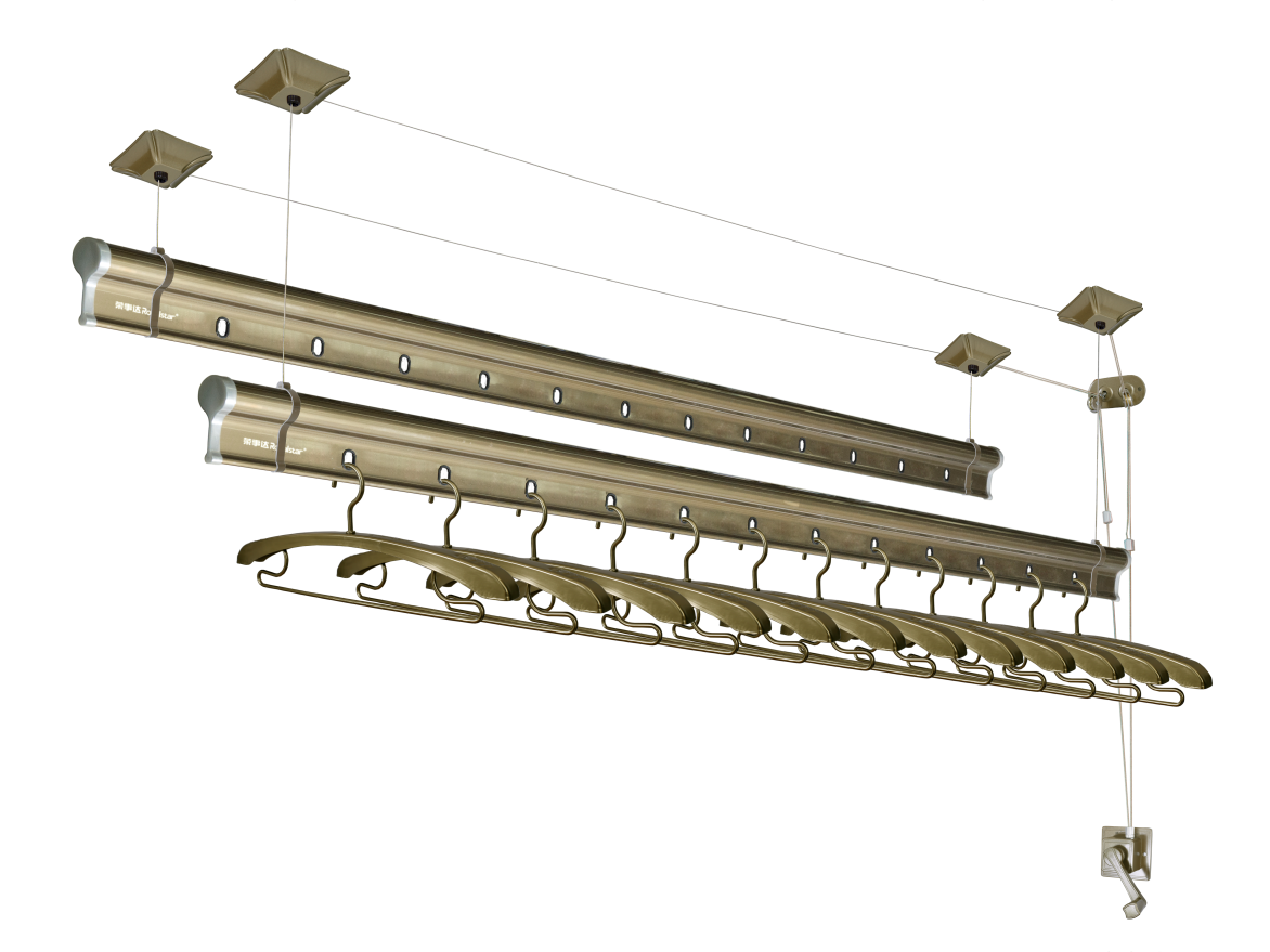 产品名称:手摇晾衣架 产品型号:RSD-7018S 顶座:方型顶 转角器:简爱圆形 钢丝绳:304/1.5M 衣撑:豪华I型宽肩纯铝衣撑 晾杆参数:2杆、24个防风挂孔 晾杆:香槟太空铝水滴杆 手摇器:简爱方形独立
