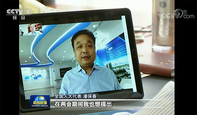 报道中,全国人大常委会委员鲜铁可,与全国人大代表、合肥荣事达电子电器集团有限公司董事长潘保春通过视频对接交流工作。潘保春董事长向鲜铁可委员汇报了荣事达目前的运转状况,并就今年全国人代会上,准备提出的关于中小企业发展的一份议案和三份建议与鲜铁可委员进行了探讨。