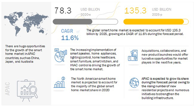 根据MarketsandMarkets发布新的市场研究报告,全球智能家居市场规模预计将从2020年的783亿美元增长到2025年的1353亿美元,预测期间复合年增长率为11.6%。