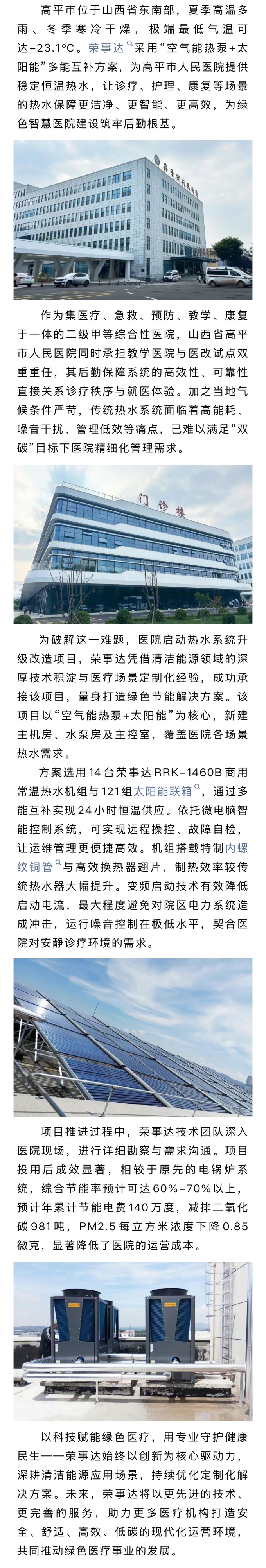 商用案例:荣事达智慧新能源,为高平医院注入绿色热水新动能