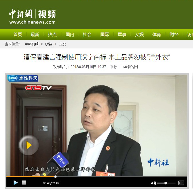 【解说】日前,全国人大代表、合肥荣事达电子电器集团董事长潘保春接受中新社记者采访时表示,目前市场上充斥了很多“非中文”商标的国产商品,潘保春认为,汉字商标使用应纳入强制标准,把使用汉字作为商标的基本要求。