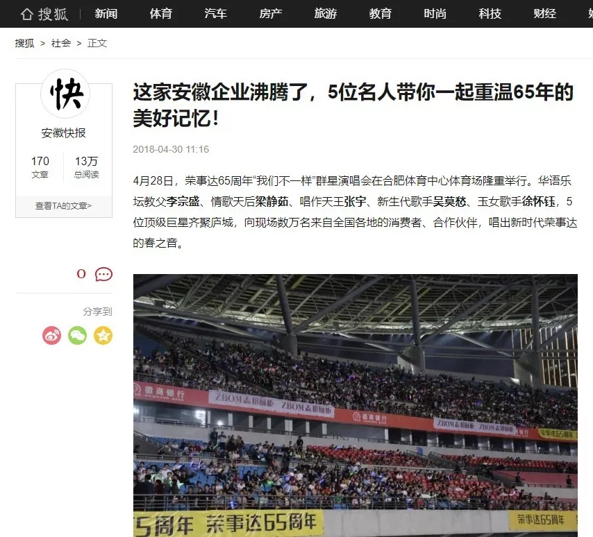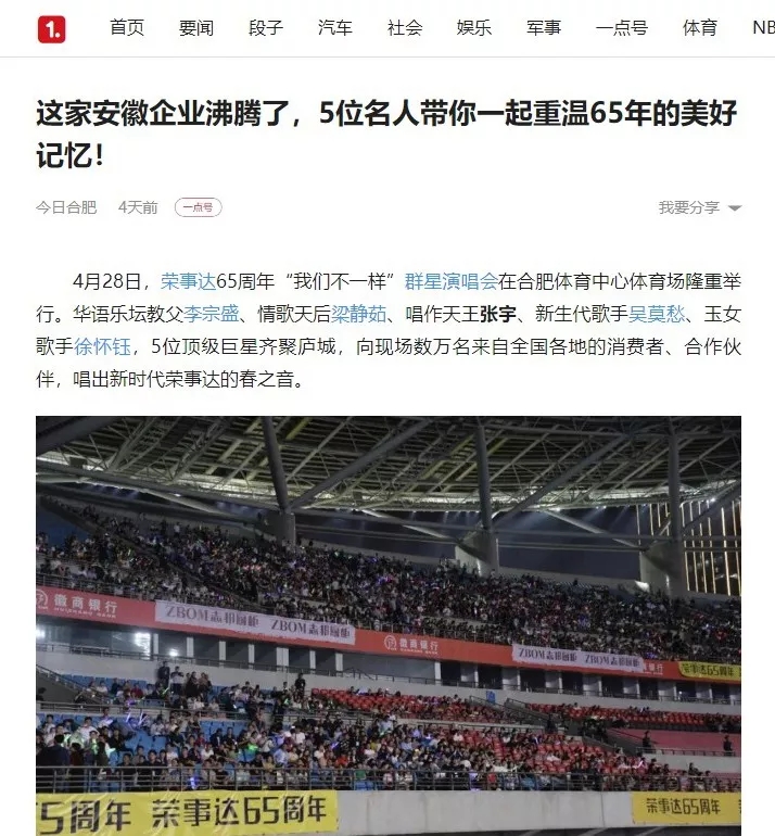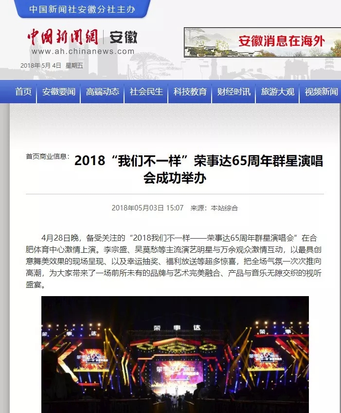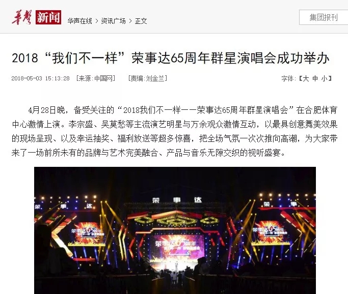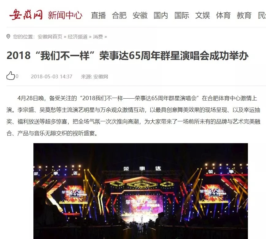 荣事达65周年“我们不一样”群星演唱会在合肥体育中心盛大开演。李宗盛、梁静茹、张宇、吴莫愁、徐怀钰等实力明星倾情献唱,在这个伟大的新时代,再次唱响了民族老品牌荣事达的最强音。四万人体育场座无虚席,共同见证荣事达集团65周年盛大庆典。
