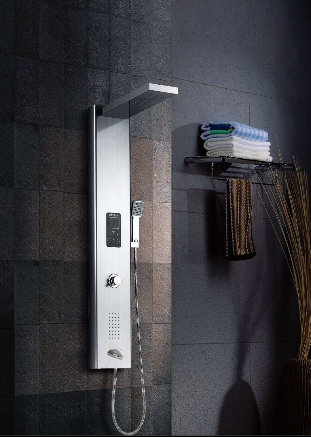 产品优势: 不锈钢黄金比例精制 麦克风SPA手持增压花洒 全铜镜面电镀阀门 LED电容触摸屏 水温在35°-55°之间随意调节 负离子净化空气 产品名称 触摸淋浴屏 产品型号 RSD-8532T 装箱数量 1套 规格尺寸 主体:1200x220