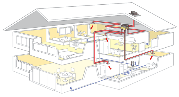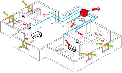 双向流新风系统是一种“强制排风,强制送风”系统,由一组强制送风系统和一组强制排风系统组成。新风由送风系统的管道进入室内,排风通过排风系统管道排至室外,新风及排风的流动方向,新风口及排风口的布置,可以根据特定要求实际布置。