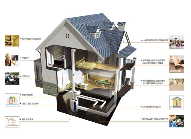 它将整体平衡式通风设计与高效换热完美地结合在一起。该系统配置了双离心式风机和整体式平衡风阀,系统从室外引入新鲜空气,经送风管道系统分配至各卧室、客厅,同时将从走廊、客厅等公共区域收集的室内混浊气流排出,在不开窗的情况下完成室内空气置换,提高室内空气品质。