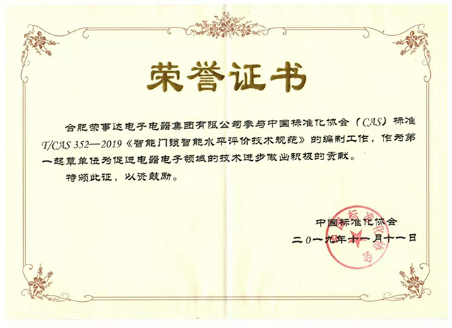 论坛上,中国标准化协会副理事长兼秘书长高建忠先生为参与智能团体标准制定的主要起草单位颁发了荣誉证书。荣事达电子电器集团作为第一起草单位,参与了中国标准化协会标准《智能门锁智能水平评价技术规范》的编制工作,对于市场上风靡的智能锁产品的智能水平进行了规范,为促进电器电子领域的技术进步做出了积极贡献。