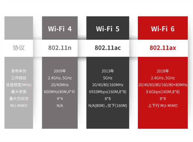 前几代Wi-Fi技术在网络覆盖、抗干扰、功耗方面有一定的欠缺。作为最新一代技术标准,Wi-Fi 6在技术层面实现了全方位升级,在传输速率、承载量、时延、覆盖范围、抗干扰性、功耗等性能上都有大幅度的提升。