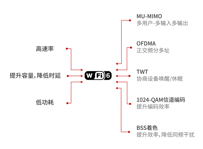 Wi-Fi 6可支持兼容2.4GHz和5GHz工作频段,还引入OFDMA(正交频分多址)、1024-QAM信道编码、BSS着色、TWT技术(目标唤醒时间)、空间复用等技术傍身,并完善了MU-MIMO(上下行多用户多输入多输出)功能。