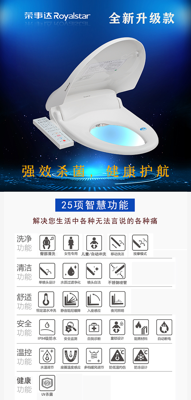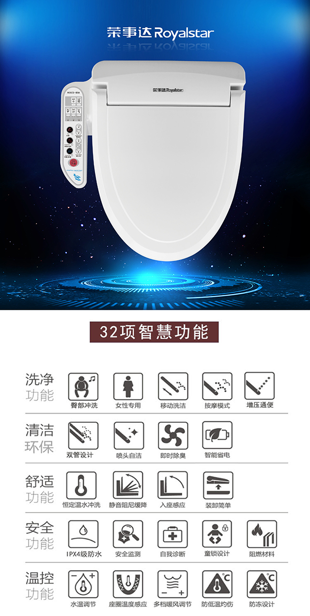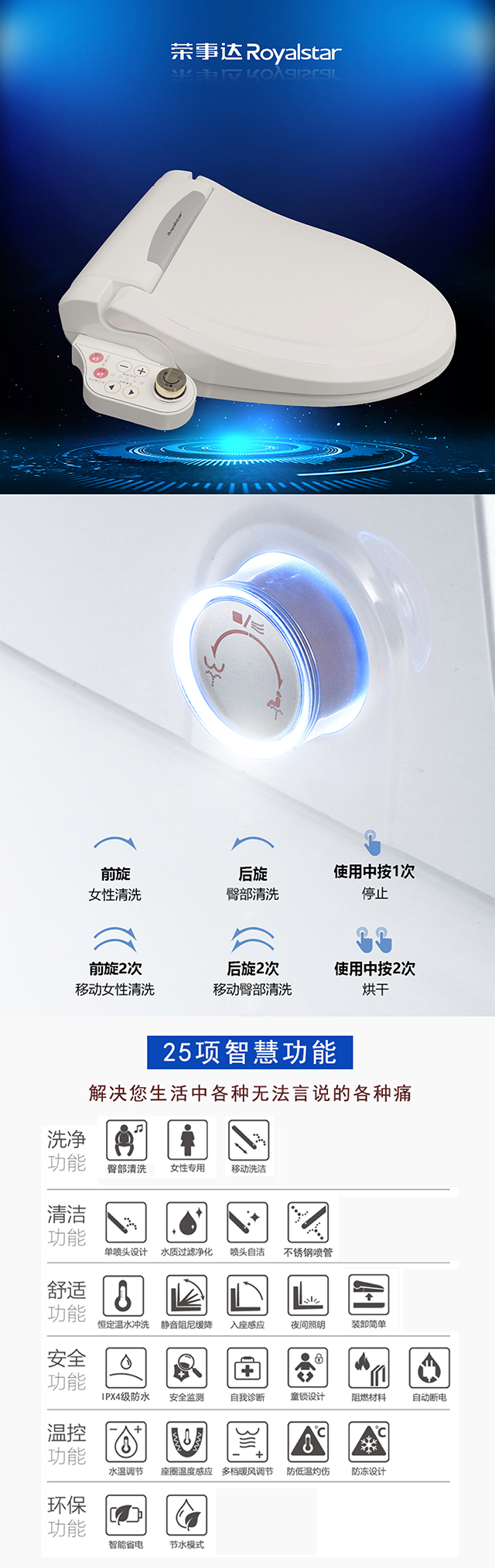 荣事达该款产品拥有臀部清洗、柔和女性清洗、喷头前后移动清洗、四挡水压调节清洗、智能记忆清洗五大清洗模式。