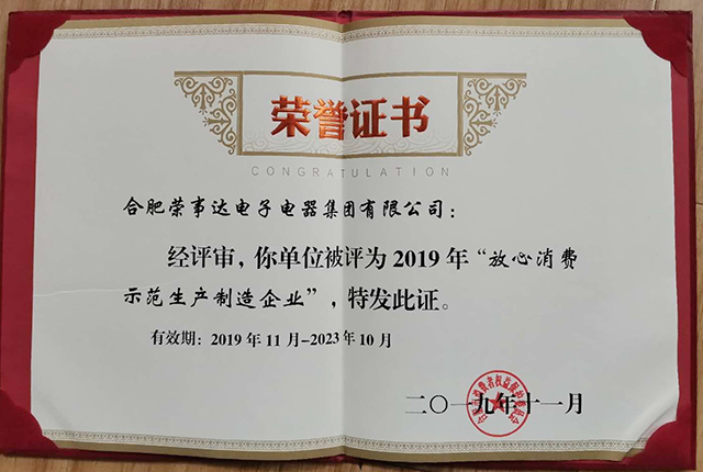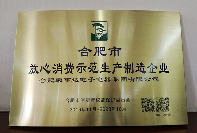 4月14日,合肥荣事达电子电器集团有限公司获评“合肥市放心消费示范生产制造企业”。