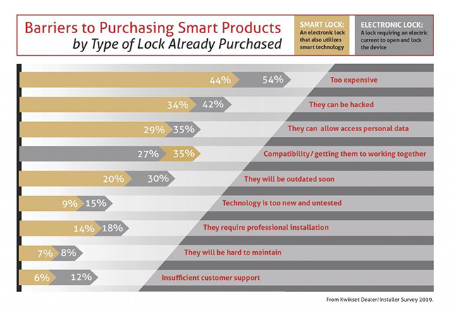 Kwikset从研究中发布的第一笔数据按已购买的锁的类型(智能锁与电子锁)分析了购买智能产品的障碍。