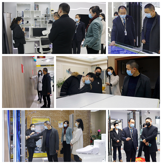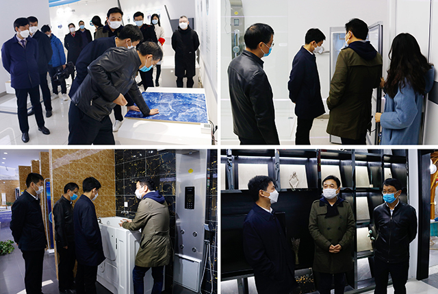 在荣事达双创中心,领导一行观摩体验了荣事达发热瓷砖、健康淋浴设备、顶墙集成、教室灯等现阶段重点复工项目产品。