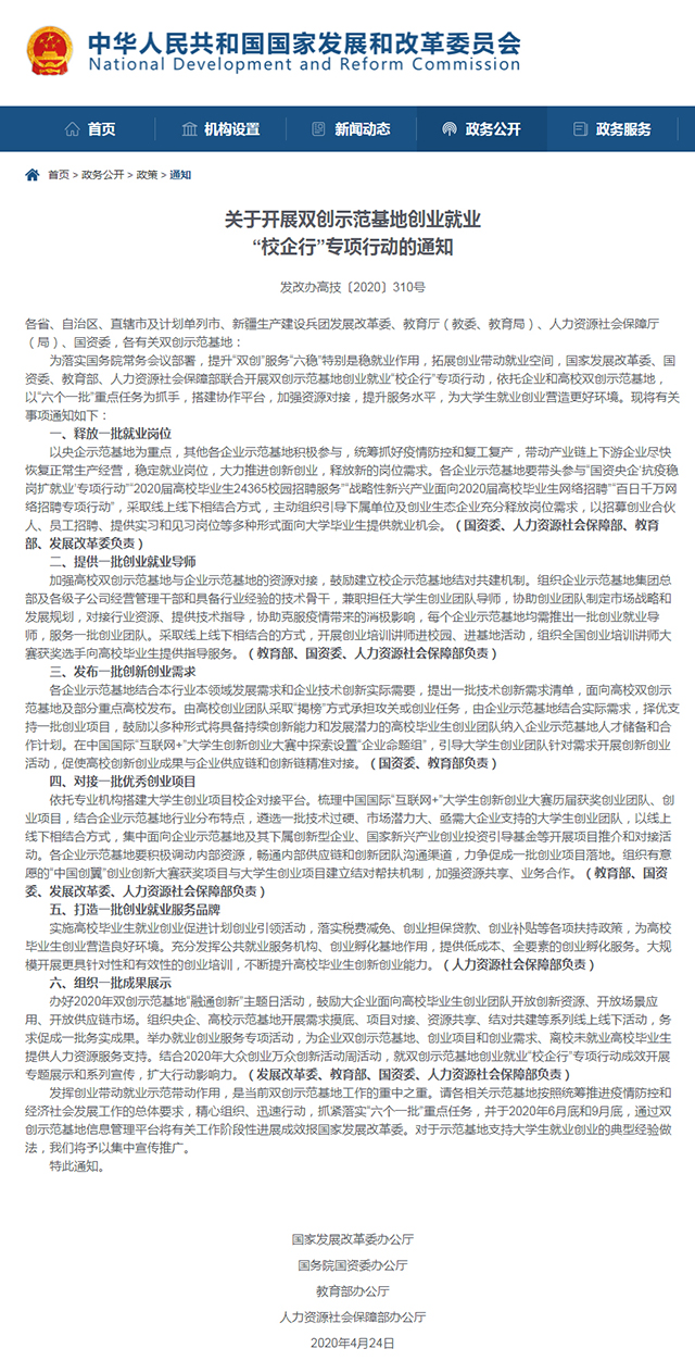 2020年4月,国家发改委、国务院国资委、教育部、人社部四部门联合印发《关于开展双创示范基地创业就业“校企行”专项行动的通知》。5月8日,四部门联合召开专项行动启动会。