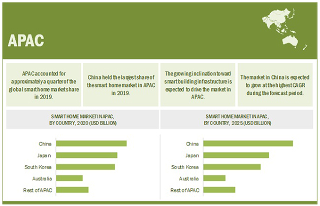 亚太地区的智能家居市场预计将在预测期内高速增长。由于新的住宅项目数量不断增加,以及加强亚太地区建筑基础设施的举措不断增多。在日本、韩国、中国和亚太其他地区(RoAPAC),对智能家居的需求很大。