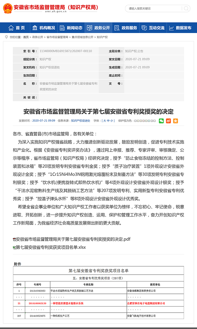 日前,安徽省市场监管局官网上发布了《关于第七届安徽省专利奖授奖的决定》,合肥荣事达电子电器集团有限公司的“一种智能坐便器水箱排水系统”获省专利优秀奖。