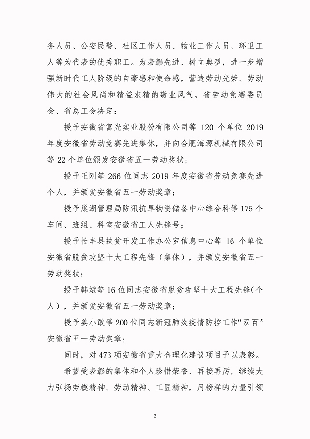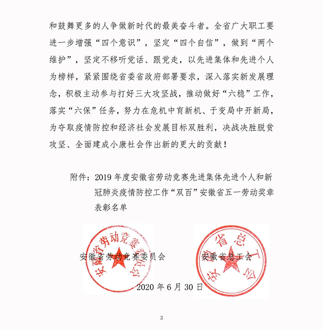 近日,安徽省总工会印发《关于表彰2019年度安徽省劳动竞赛先进集体先进个人和新冠肺炎疫情防控工作“双百”安徽省五一劳动奖章的决定》,表彰一批先进集体先进个人。