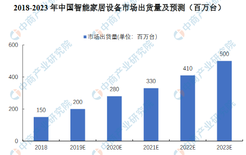 随着无线连接技术和低功耗芯片设计技术的成熟,智能家居产品消费门槛逐步降低,消费者接受度不断提高,智能家居行业真正开始快速发展,成长为物联网行业最具潜力的细分市场之一。据统计,2018年中国智能家居市场累计出货近1.5亿台,同比增长36.7%,其中第四季度出货4610万台,同比增长45.4%。预计未来五年中国智能家居设备市场将持续快速增长,2023年市场规模将接近5亿台,年均复合增长率超过20%。