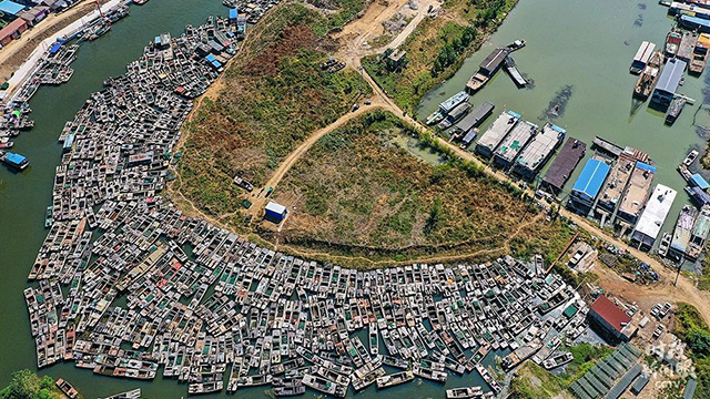 △国家实施长江流域禁捕退捕政策后,江苏宿迁泗洪县启动洪泽湖水域禁捕退捕和住家船整治工作。这是聚集在渔港等待拆解的渔船。
