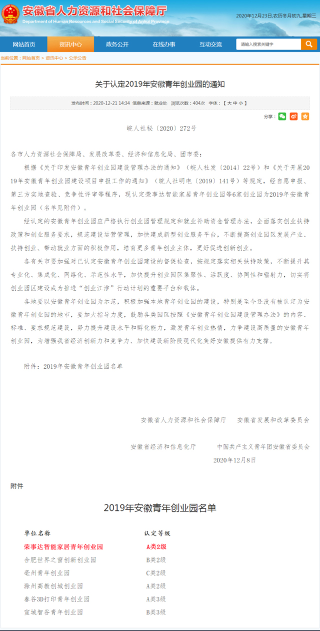 近日,安徽省人力资源和社会保障厅发布了《关于认定2019年安徽青年创业园的通知》。由合肥荣事达电子电器集团有限公司建设运营的荣事达智能家居青年创业园获评省级青年创业园资质,被认定为A类2级安徽省青年创业园。
