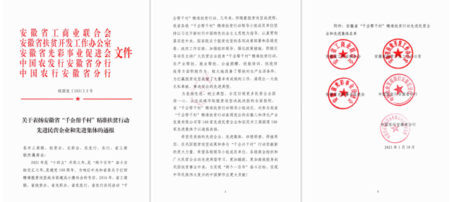 2016年,按照全国“万企帮万村”精准扶贫行动领导小组的统一部署,安徽省工商业联合会牵头,联合安徽省扶贫开发工作办公室、安徽省光彩事业促进会、中国农发行安徽省分行、中国农行安徽省分行共同启动“千企帮千村”精准扶贫行动。几年来,广大民营企业积极投身脱贫攻坚,在产业帮扶、就业帮扶、公益捐赠、技能培训、抗疫防疫等方面积极作为,极大地改善了帮扶村生产生活条件,为打赢脱贫攻坚战做了大量卓有成效的工作。