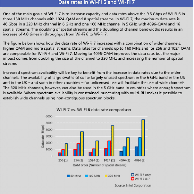 Wi-Fi7标准有许多拟议的功能,但对Wi-Fi6的直接增强包括支持320MHz传输(是802.11ax的160MHz的两倍)、使用更高的调制阶数,可选地支持4096-QAM(高于802.11ax中的1024-QAM)以及多个资源单元(例如OFMDA音调组)的分配。