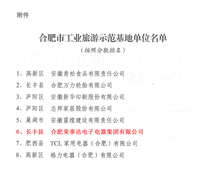 日前,首批合肥市工业旅游示范基地名单发布。荣事达集团顺利通过验收,进入市级示范基地行列。