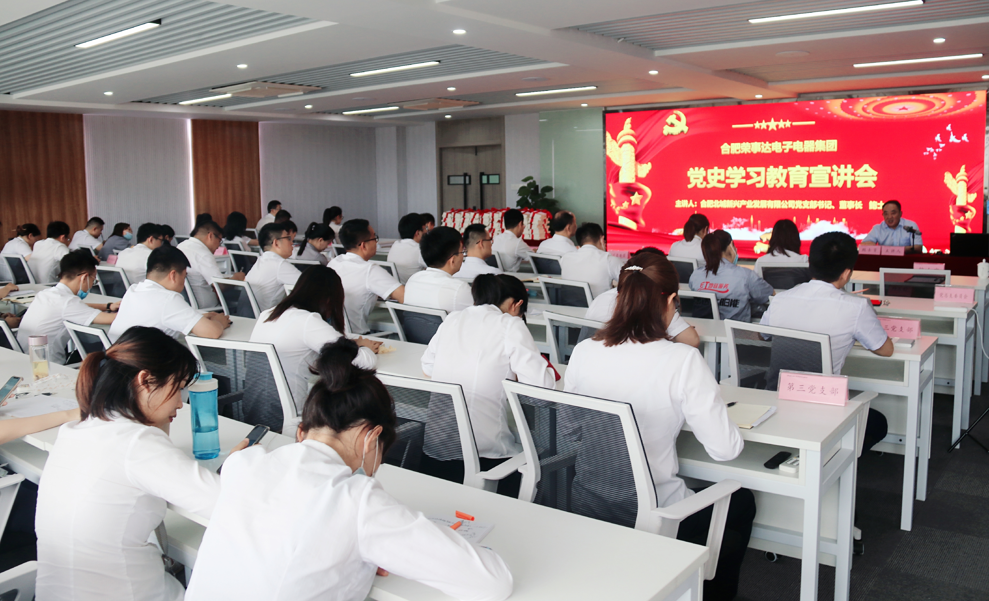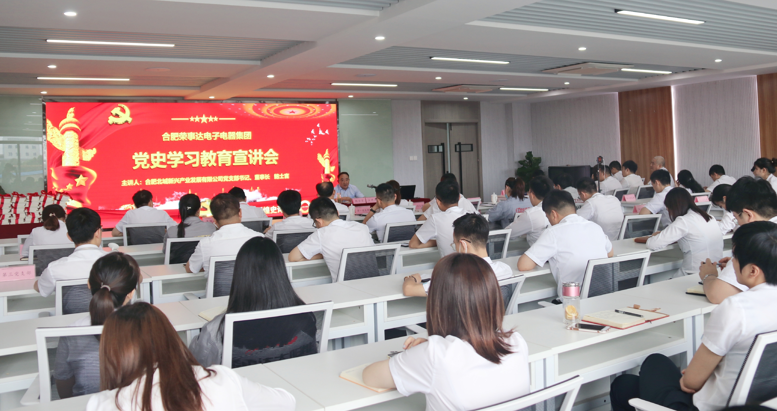 此次会议由合肥北城新兴产业发展有限公司党支部书记、董事长鲍士言担任主讲,荣事达集团党总支书记、常务副总裁张跃明,集团工会主席、副总裁罗松,集团党组织班子成员、各支部书记及集团部分党员代表现场参会。