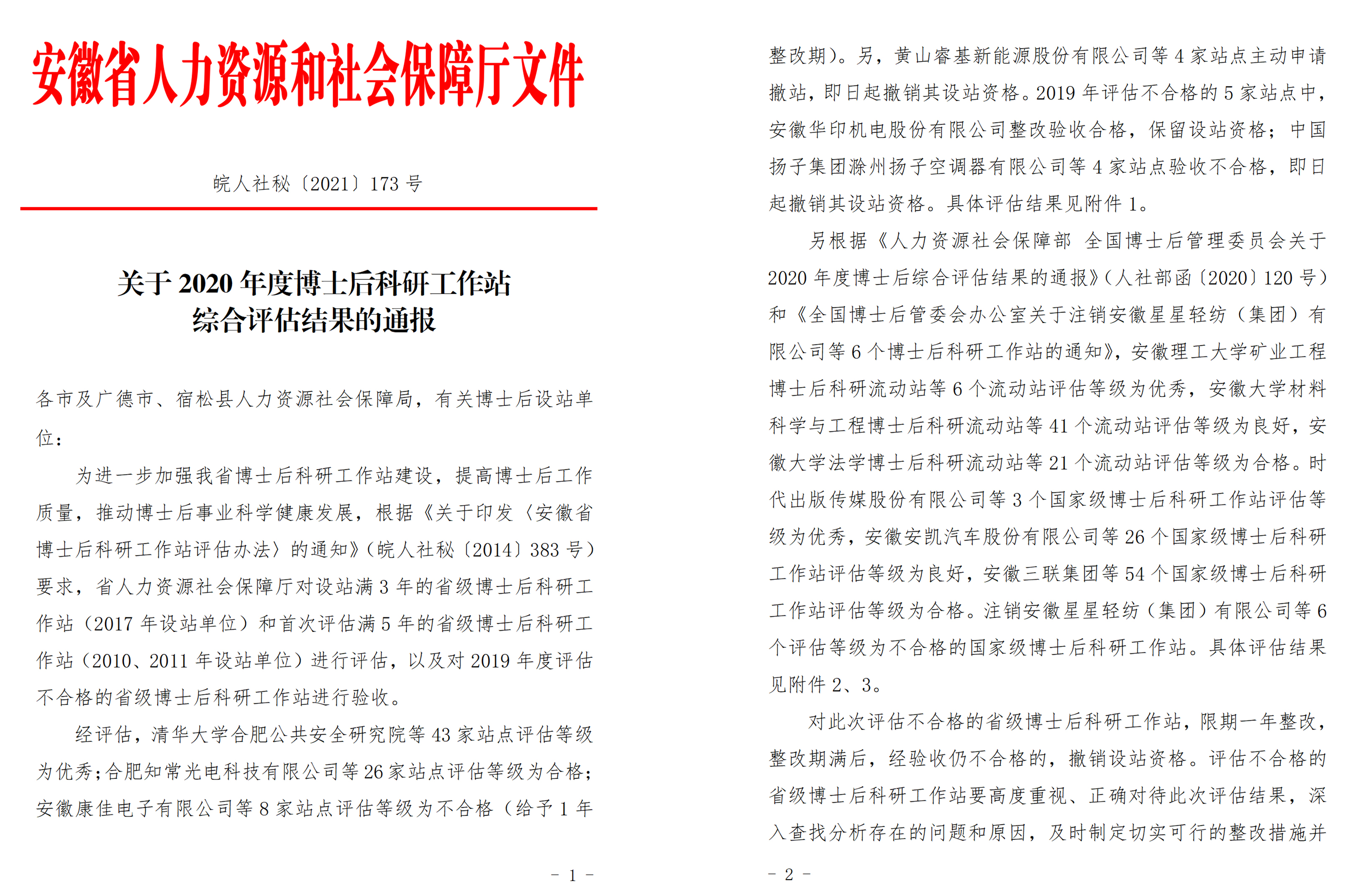 近日,在安徽省人力资源和社会保障厅2020年度省级博士后科研工作站评估工作中,荣事达博士后科研工作站获评“优秀”等级。
