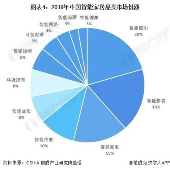 从细分市场的占比来看,智能家居品类中家庭安全、智能照明、智能家电、智能影音占据最大额的市场份额。家庭安全的组成部分包含了智能门锁、智能安全传感器 与智能摄像机等产品 。