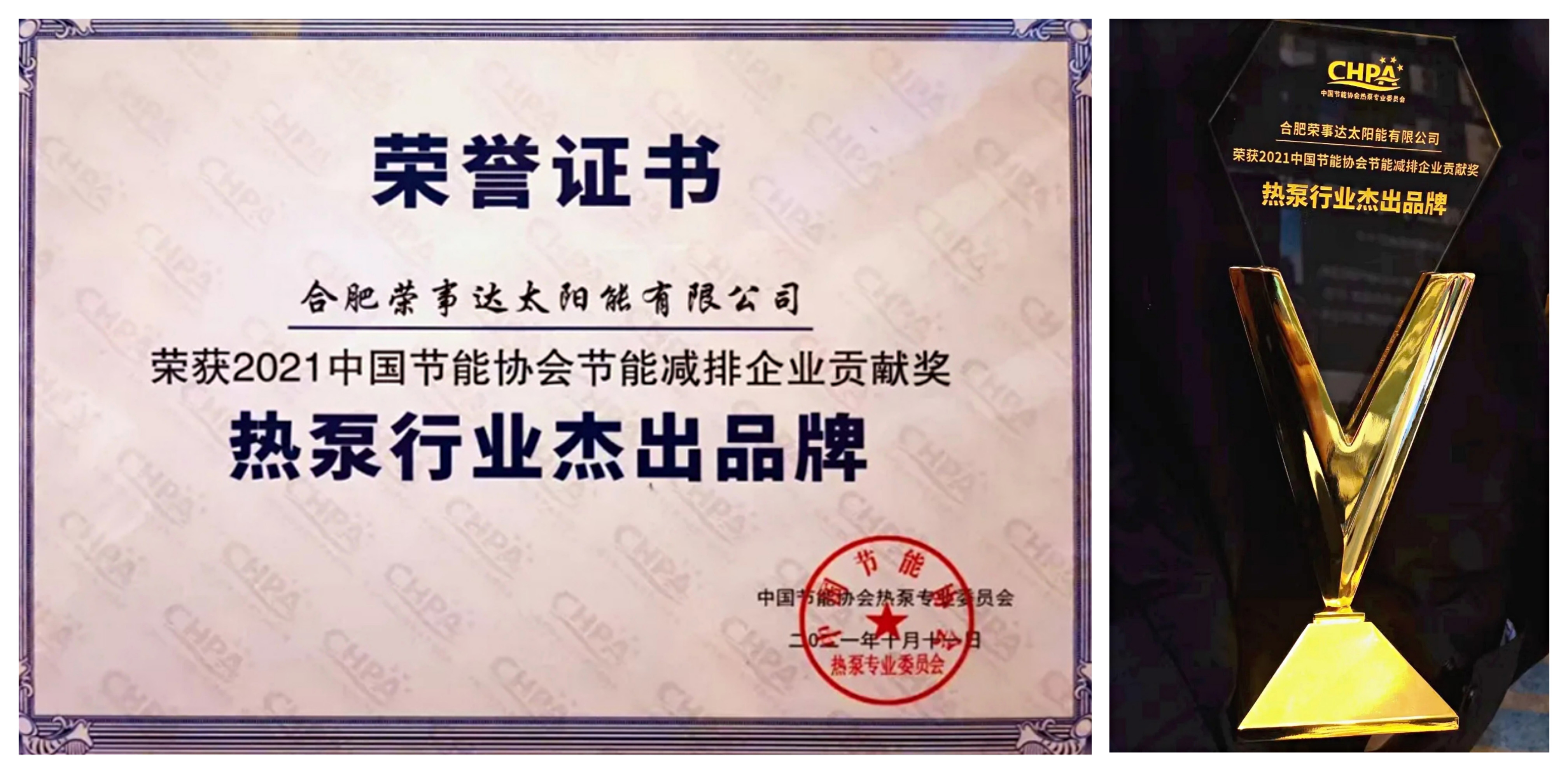 10月12日,由中国节能协会主办、中国节能协会热泵专委会承办的,2021中国热泵行业年会在武汉胜利闭幕,荣事达集团再传捷报:国家双创示范基地项目单位——荣事达太阳能有限公司荣获“2021年度中国热泵行业杰出品牌”。