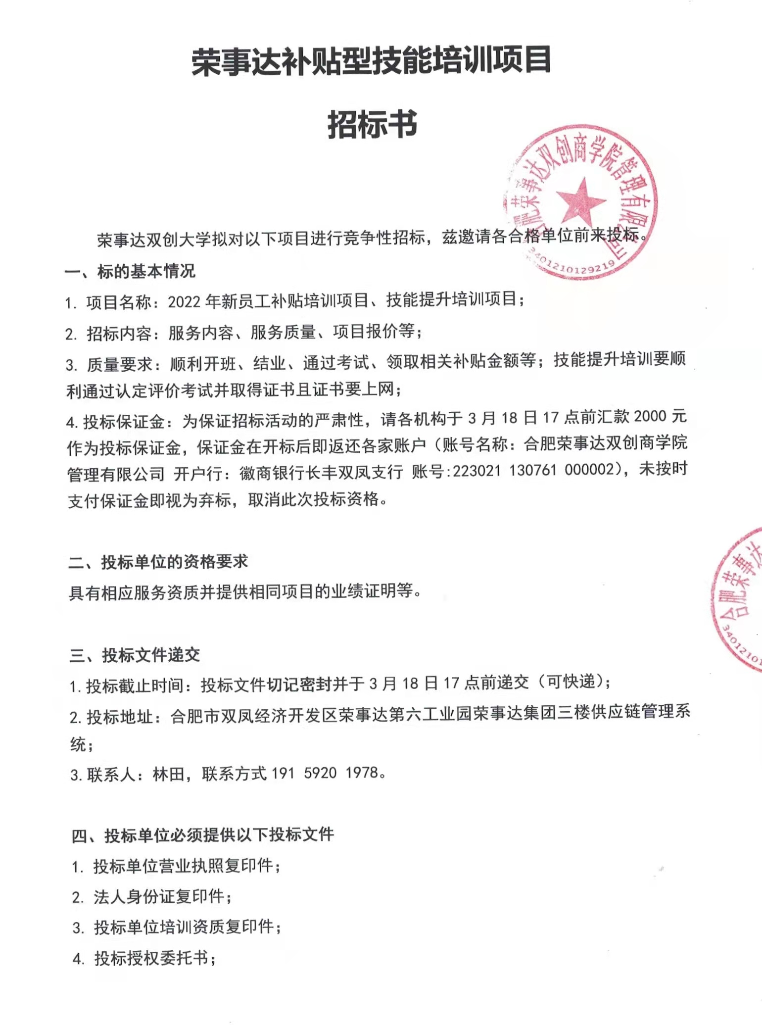 荣事达补贴型技能培训项目招标书