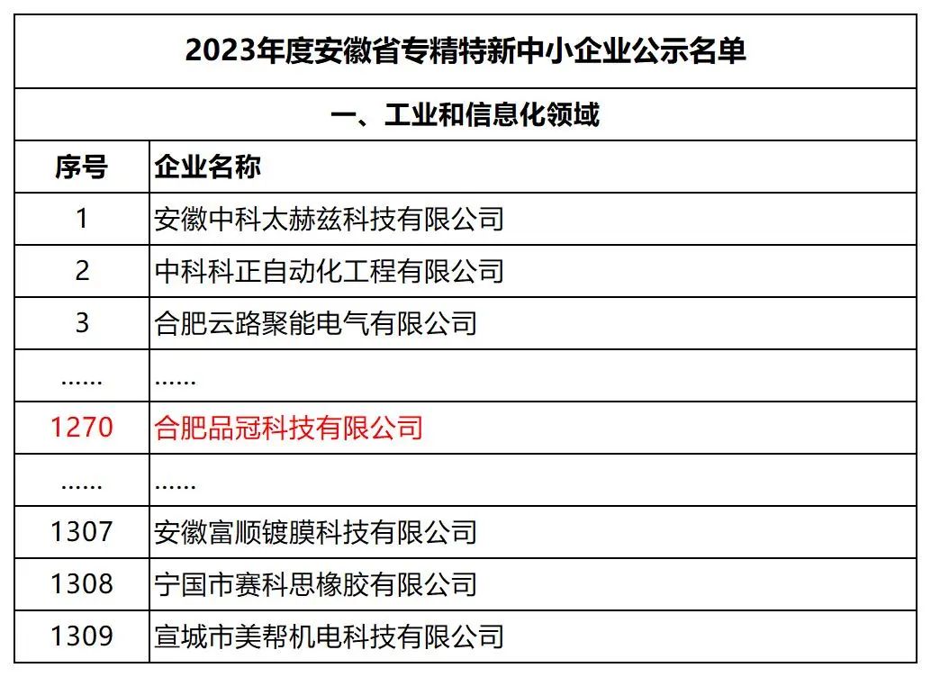 日前,安徽省经济和信息化厅发布了《关于2023年度安徽省“专精特新”中小企业名单的公示》,经专家评审和综合评估,荣事达国家双创示范基地项目单位合肥品冠科技有限公司入选安徽省2023年“专精特新”中小企业名单。