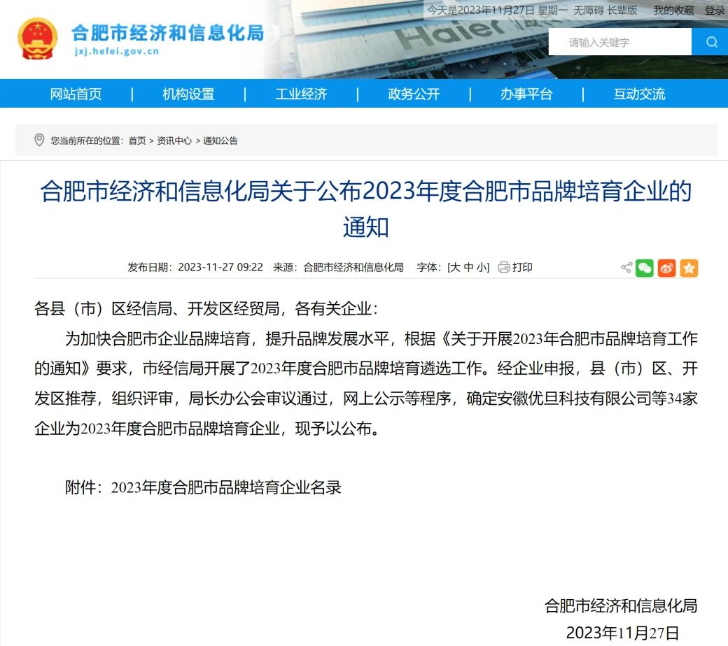 据悉,此次认定是根据《关于开展2023年合肥市品牌培育工作的通知》要求,经企业申报,县(市)区、开发区推荐,组织评审,局长办公会审议通过,网上公示等程序,层层遴选而成;入选的品牌建设培育企业,在品牌建设方面具有创新能力强、管理体系完善、效益增长较快等特点,特别是在品牌保障机制、品牌战略布局等方面拥有个性化特色。