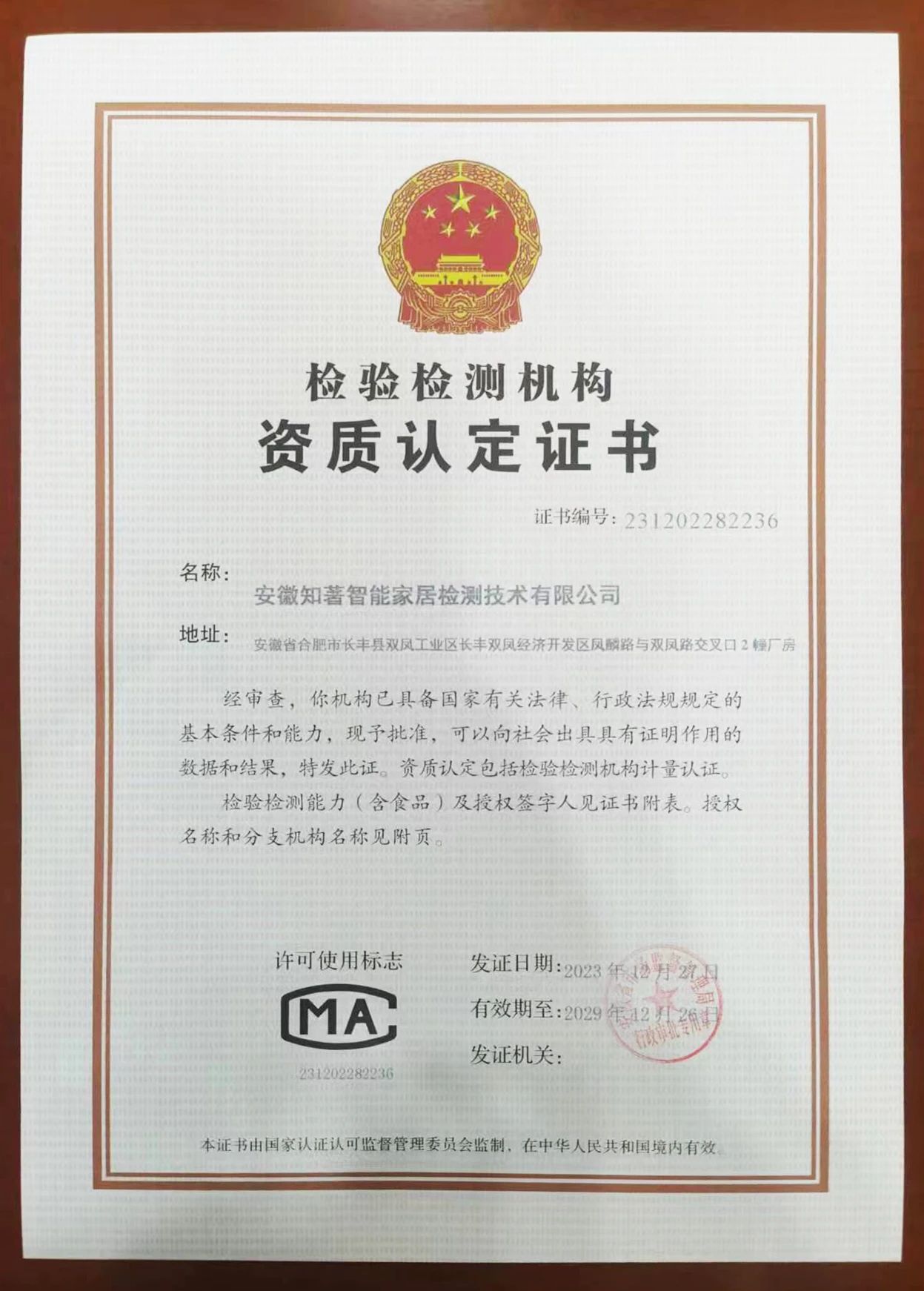 日前,荣事达集团旗下安徽知著智能家居检测技术有限公司,顺利通过CMA资质认证,并获得由安徽省市场监督管理局颁发的检验检测机构资质认定(CMA)证书,表明了其检验检测资质和能力得到了政府部门的权威认可。