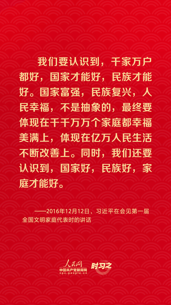 团圆是春节永恒的主题。“没有国家繁荣发展,就没有家庭幸福美满。同样,没有千千万万家庭幸福美满,就没有国家繁荣发展。”习近平总书记曾在多个场合深刻阐述家庭与国家之间的关系,从他的话语里一起感悟深厚的家国情怀。