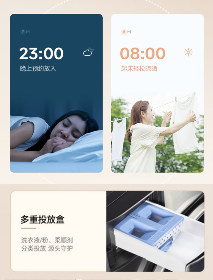 荣事达大薄系列滚筒洗衣机(XQG120-18DQ)配置了多重投放盒,实现洗衣粉/洗衣液、柔顺剂的分类投放,从源头守护爱衣。贴心提供24小时超长预约定制洗涤功能,精准控制洗衣时间,可以让用户更加合理的安排时间,确保衣物在需要的时间内洗好。工作一天回到家,再也不用睡眼惺忪的等待晾晒衣物了!