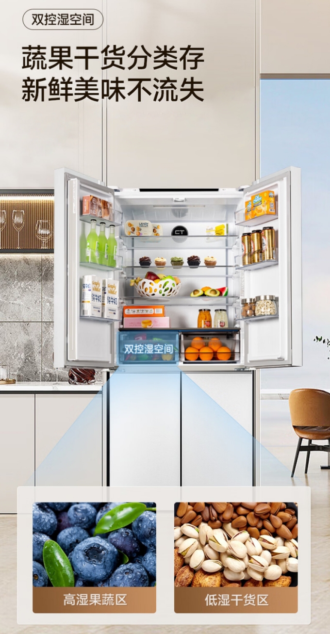 此外,这款冰箱还专门设置了双控湿空间,干货可以采用低湿存储,锁住营养和新鲜度。蔬果采用高湿存储,保鲜口感不打折。