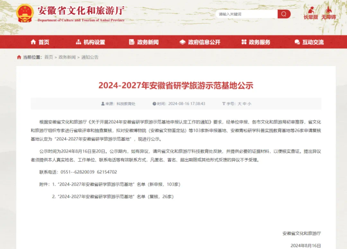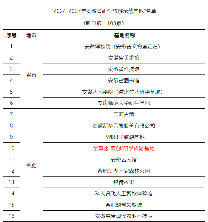 近日,安徽省文化和旅游厅发布了《2024-2027年安徽省研学旅游示范基地公示》,其中,荣事达“双创”研学旅游基地成功认定为“2024-2027年安徽省研学旅游示范基地”!