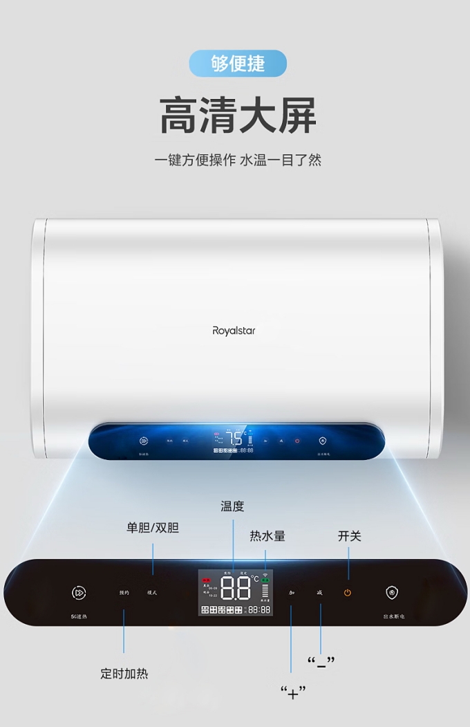 荣事达电热水器(RSD-T01-50)拥有令人瞩目的高清大屏,能将热水器的各项信息生动而精准地展示在用户眼前。一键操作的设计理念,将复杂的功能简化为只需轻轻一按的简单动作。无论是忙碌一天后疲惫不堪的上班族,还是对复杂电器操作感到困难的老年人,都无需再面对繁琐的按键和复杂的说明书,真正做到了便捷操作与实用功能的无缝融合。