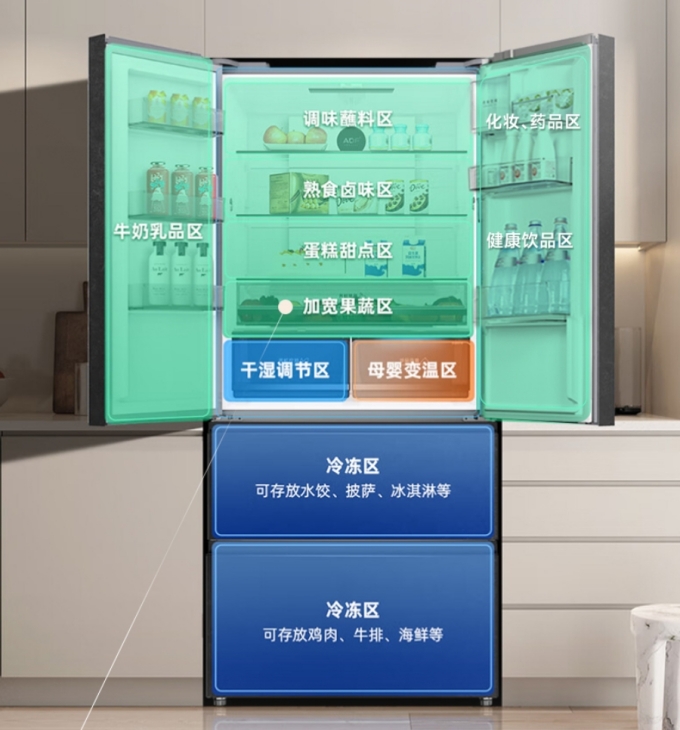 法式四门的设计是荣事达这款冰箱的一大亮点。冷藏室空间宽敞,多层搁架可以根据不同食材进行灵活存放,无论是高大的饮料瓶,还是小巧的酱料盒,都能找到合适的位置。同时,冷藏室配备了精致的干湿调节区,适宜的湿度环境能够保持食材的新鲜度和营养价值。冷冻室同样表现出色,大容量的设计可以满足家庭大量冷冻食材的需求。法式四门的分区使得冷冻室的取放更加方便,无论是整块的肉类、成袋的水饺,还是各种海鲜,都能有序存放,轻松拿取,让用户的冷冻食材管理井井有条。