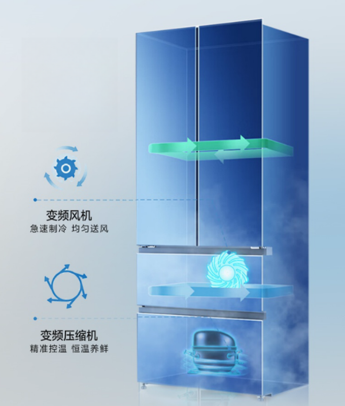 传统冰箱风速档位少,无法根据冰箱内部温度的变化进行智能调节,这就容易导致冰箱内部温度分布不均匀,部分区域的食品可能会因温度过低而结冰,而其他区域的食品则可能温度不够低,影响保鲜效果。荣事达零嵌系列法式四门冰箱(BCD-515WFGPQ)的风机和压缩机均采用变频技术,可以根据冰箱内部不同区域的温度状况自动调节转速,为食物提供了更适宜的储存环境,有利于延长食品的保鲜期。