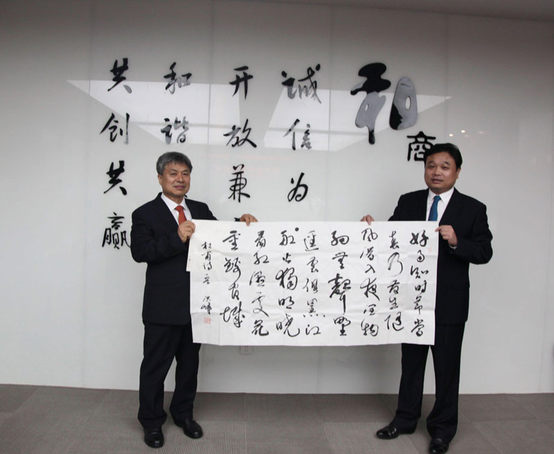 签约仪式上,双方就未来技术合作与研发方向进行了广泛而又深入的研讨,达成一致意见并成功签约。最后潘保春董事长代表荣事达集团向韩方合作伙伴赠送了代表中国传统文化的书法作品。