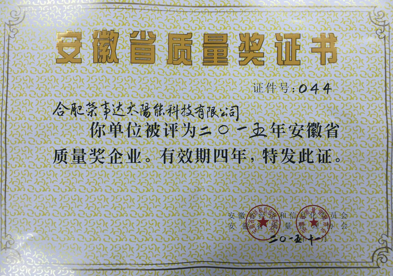 1月20日, 在由安徽省经信委召开的2015年省质量奖工作总结会议上,合肥荣事达太阳能成功入围“2015年安徽省质量奖”榜单。