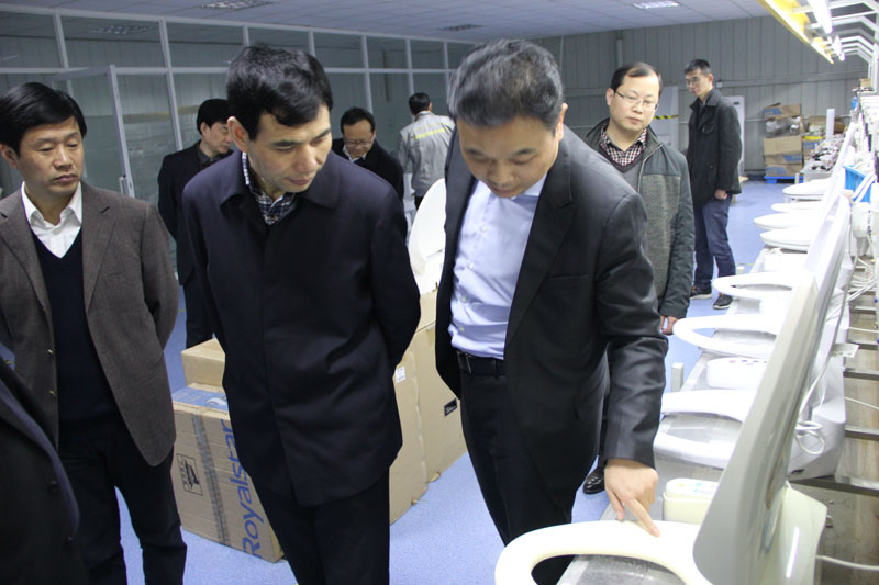 在集团董事长潘保春的陪同下,刘正义县长带领考察团成员深入生产车间和研发实验室,仔细了解企业生产研发状况。在检测室,一台微微泛黄的旧机器引起了刘县长的关注,“这台机器看上去很旧?”质检人员告诉县长,这是公司2004年生产的第一台洁身器,十几年来,一直在检测台上进行老化运行实验,并且公司每年都会将生产的第一台机器保留在实验室,进行寿命运行检测。