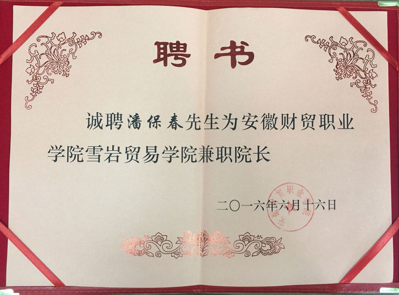 6月16日,荣事达电子电器集团有限公司董事长潘保春获聘为安徽财贸职业学院雪岩贸易学院兼职院长。