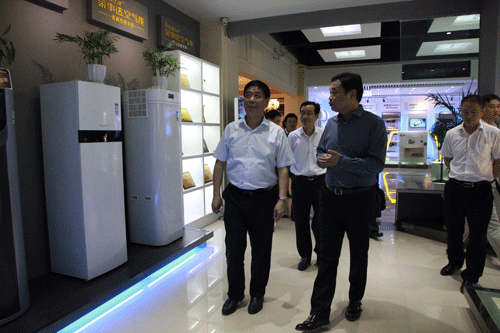 在荣事达空气能产品展厅,潘保春董事长向调研组一行详细介绍,空气能热水机的工作原理。