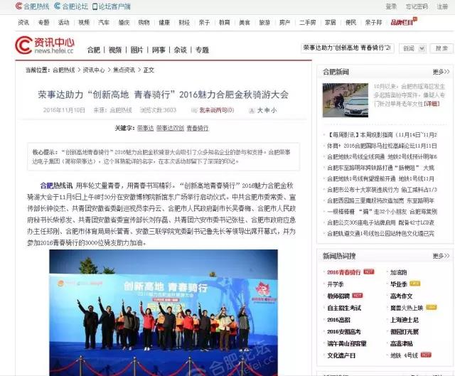 2016年11月10日,合肥热线报道了“创新高地 青春骑行”2016魅力合肥金秋骑游大会,报道原文如下: