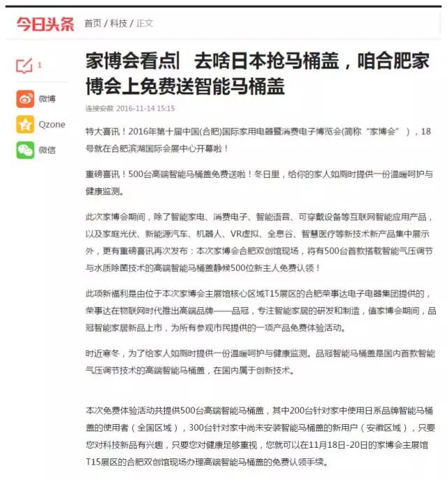 11月15日,《新华网》《今日头条》《合肥在线》分别以《荣事达:大企业双创,亮相家博会》《去啥日本抢马桶盖,咱合肥家博会上免费送智能马桶盖》《荣事达智能全屋系统将“搬到”家博会》为题报道了荣事达即将亮相家博会的消息。